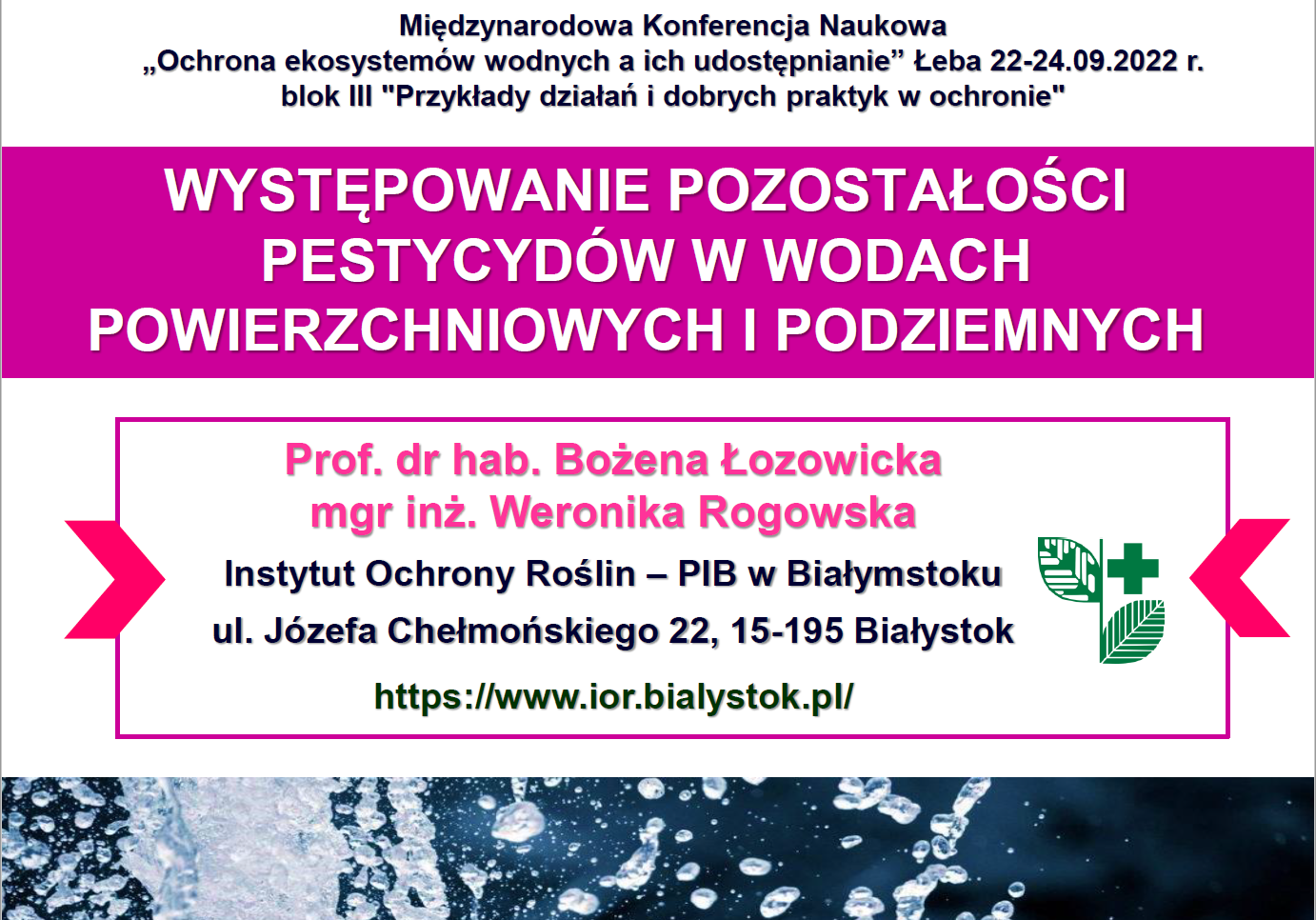 W dniach 22-24 września 2022 r. w Łebie oraz na terenie Słowińskiego Paku Narodowego odbyła się międzynarodowa konferencja „Ochrona ekosystemów wodnych a ich udostępnianie” na której Pani Profesor Bożena Łozowicka zaprezentowała temat "Występowanie pozostałości pestycydów w wodach powierzchniowych i podziemnych”.
