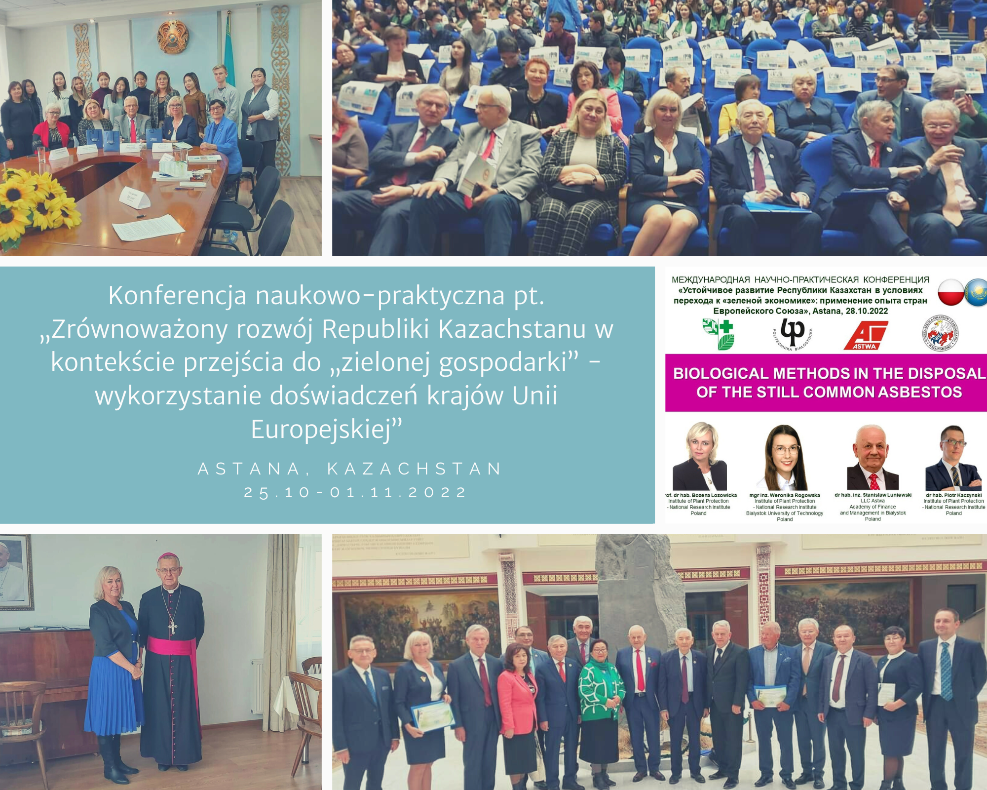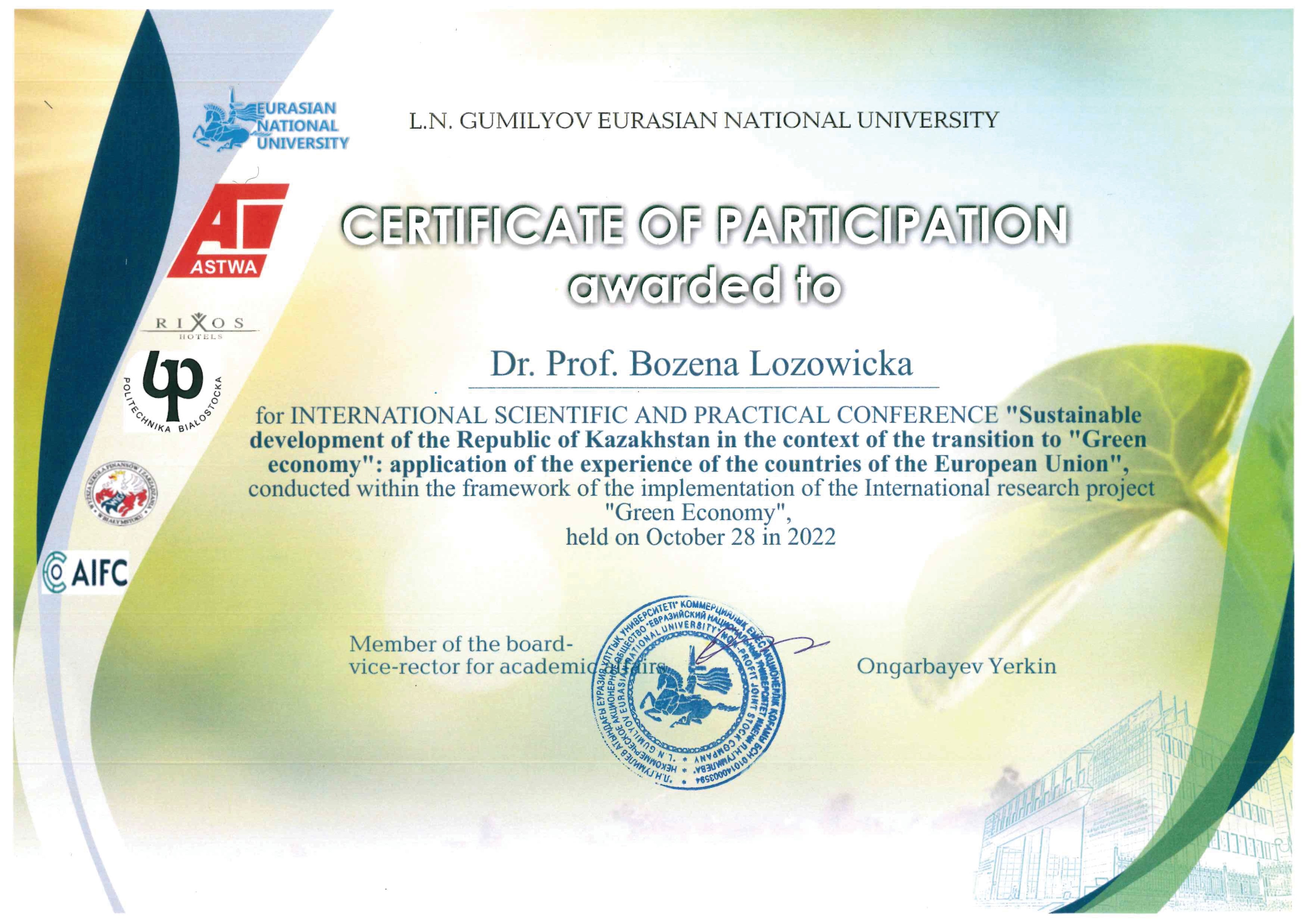 W dniu 28.10.2022 r. na Wydziale Ekonomicznym Euroazjatyckiego Uniwersytetu Narodowego w Astanie odbyła się konferencja naukowo-praktyczna pt. „Zrównoważony rozwój Republiki Kazachstanu w kontekście przejścia do „zielonej gospodarki” - wykorzystanie doświadczeń krajów Unii Europejskiej”. W ramach niniejszej konferencji Pani Profesor Bożena Łozowicka zaprezentowała wykład pt. Asbestos products recycling as an integral part of the "green economy”.