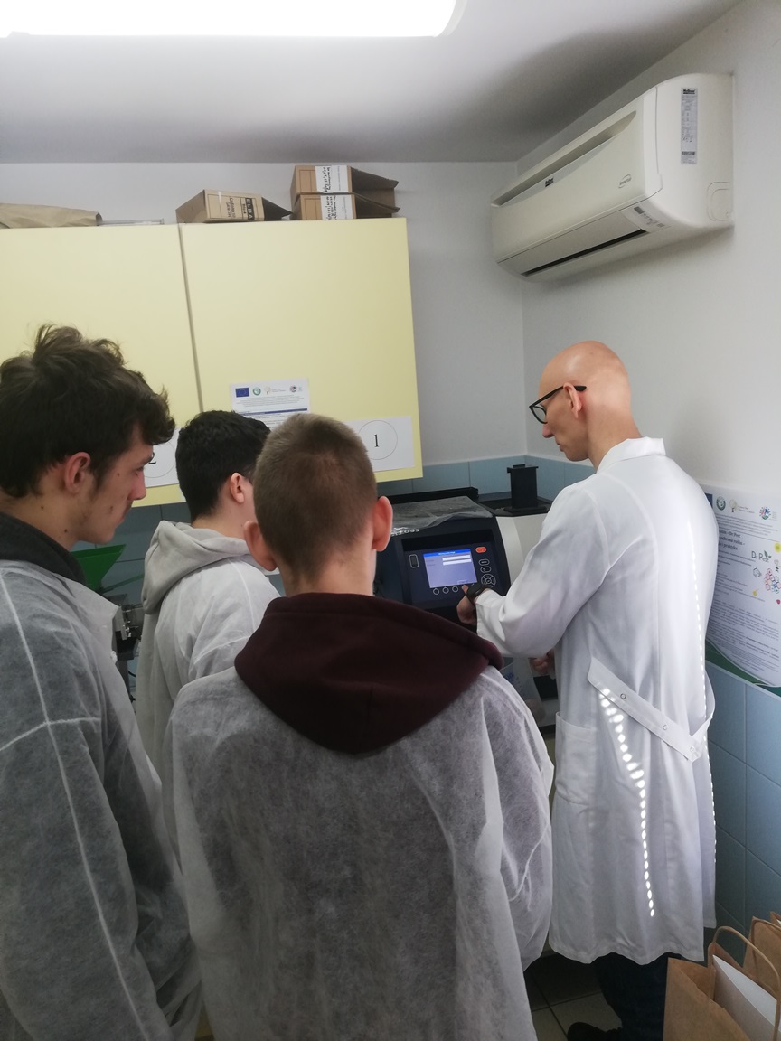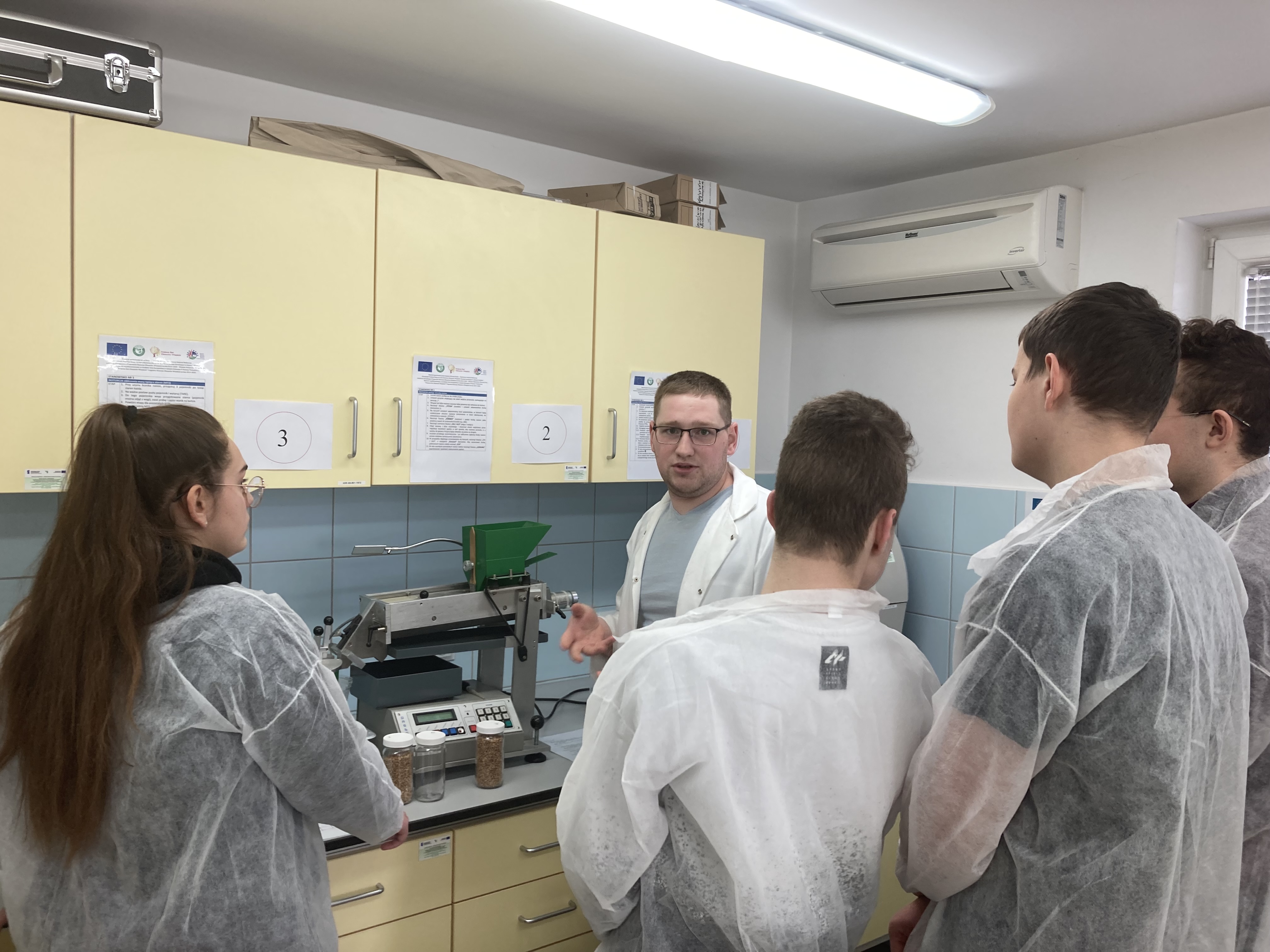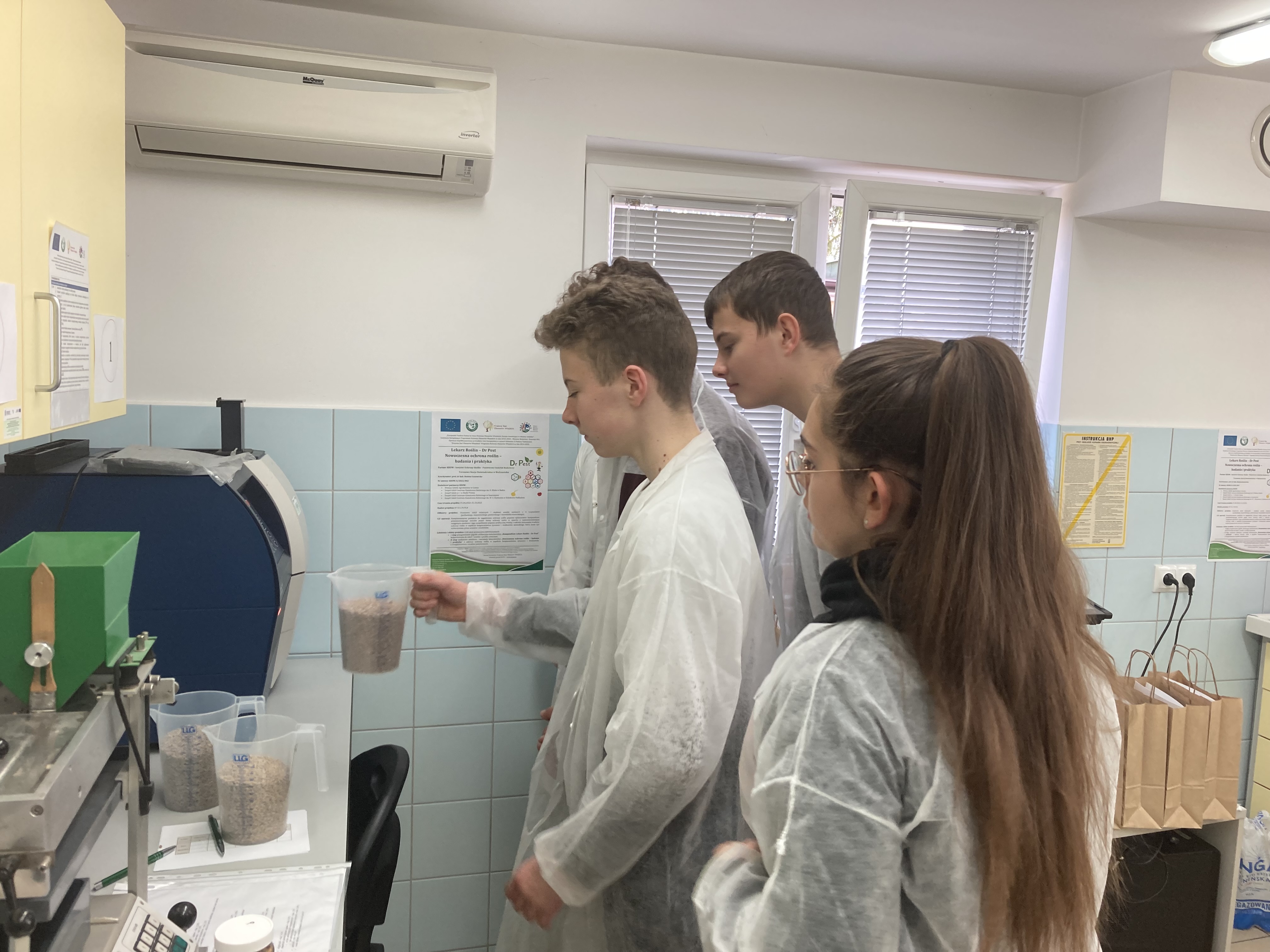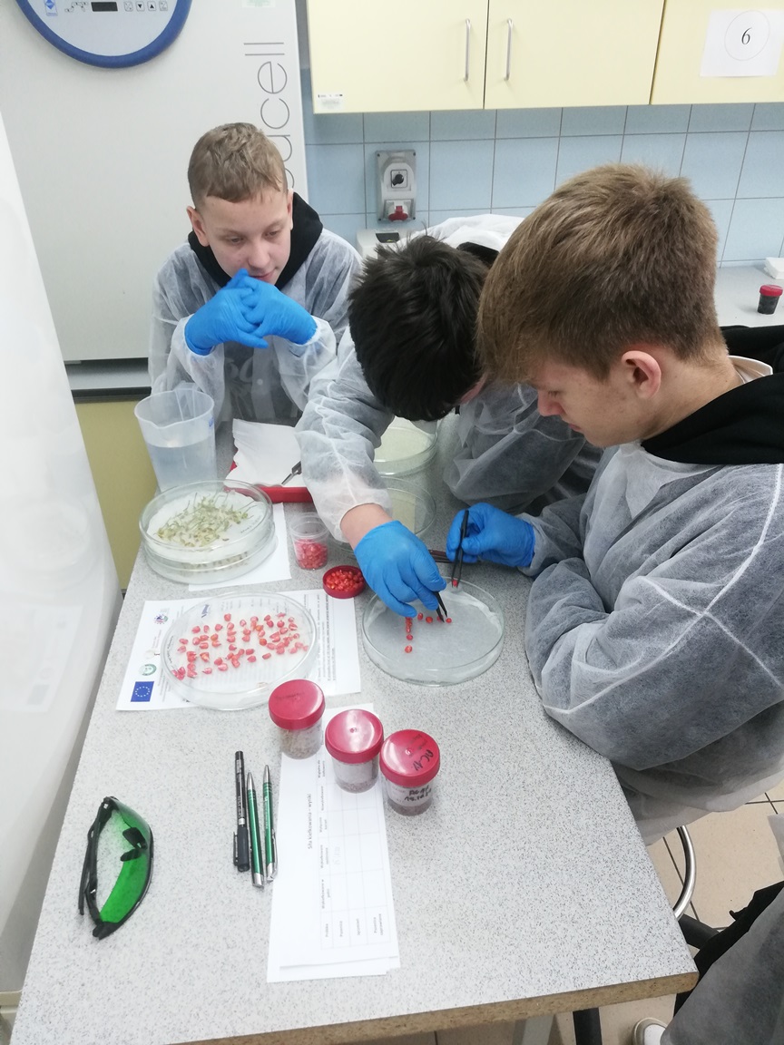 Uczniowie mieli niepowtarzalną szansę przyjrzenia się z bliska jak wyglądają doświadczenia w fitotronie czy w jaki sposób monitorować mszyce odłowione z aspiratora Johnsona. Samodzielnie dokonali identyfikacji zbóż i ich parametrów tj. zawartość skrobi, glutenu, masa tysiąca ziaren przy pomocy analizatora ziarna, a następnie określili siłę kiełkowania.