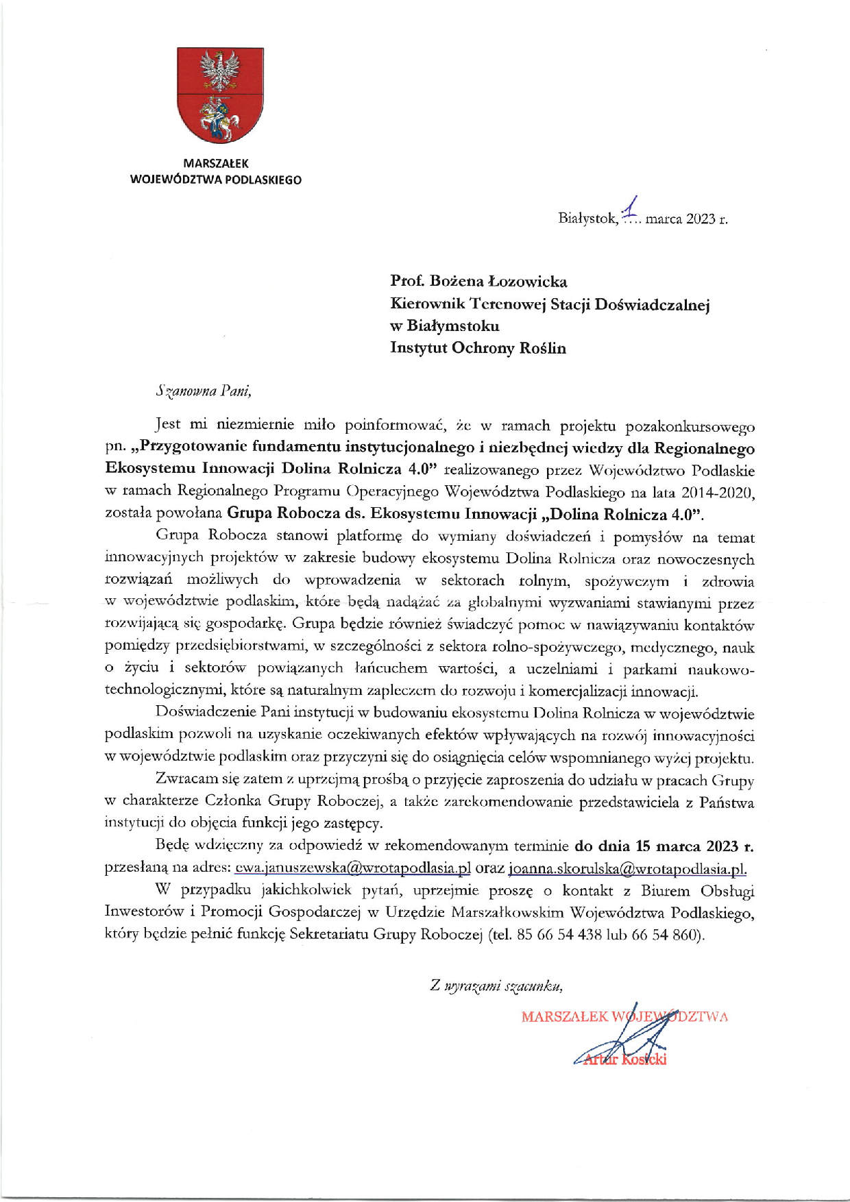 Miło jest nam poinformować, iż Pani Prof. dr hab. Bożena Łozowicka została powołana w charakterze Członka Grupy Roboczej ds. Ekosystemu Innowacji „Dolina Rolnicza 4.0”. Jednocześnie 2 marca odbyło się kolejne spotkanie niniejszej grupy pod patronatem Urzędu Marszałkowskiego Województwa Podlaskiego, na którym zaprezentowano: „Izraelski ekosystem innowacji–refleksje z wizyty studyjnej do Izraela” - Dr Mariusz Dąbrowski, Dyrektor Biura Obsługi Inwestorów i Promocji Gospodarczej, Urząd Marszałkowski Województwa Podlaskiego , „Żywność funkcjonalna –żywność przyszłości” - Prof. dr hab. Marcin Moniuszko, Prorektor ds. Nauki i Rozwoju, Uniwersytet Medyczny w Białymstoku.