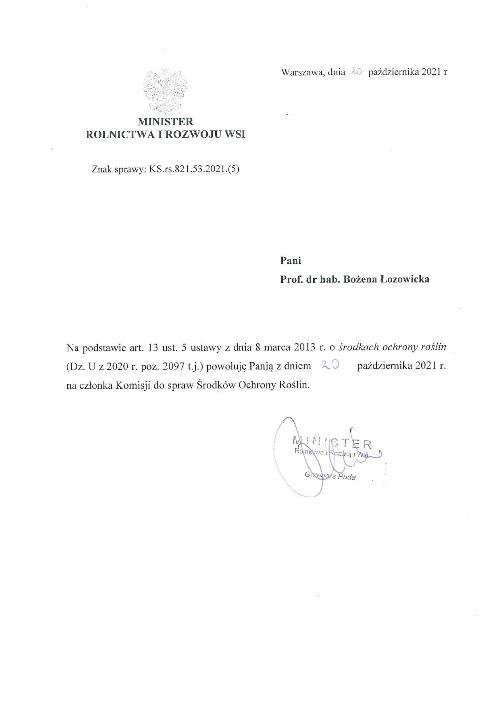 Powołanie Pani prof. dr hab. Bożeny Łozowickiej na członka Komisji do spraw Środków Ochrony Roślin