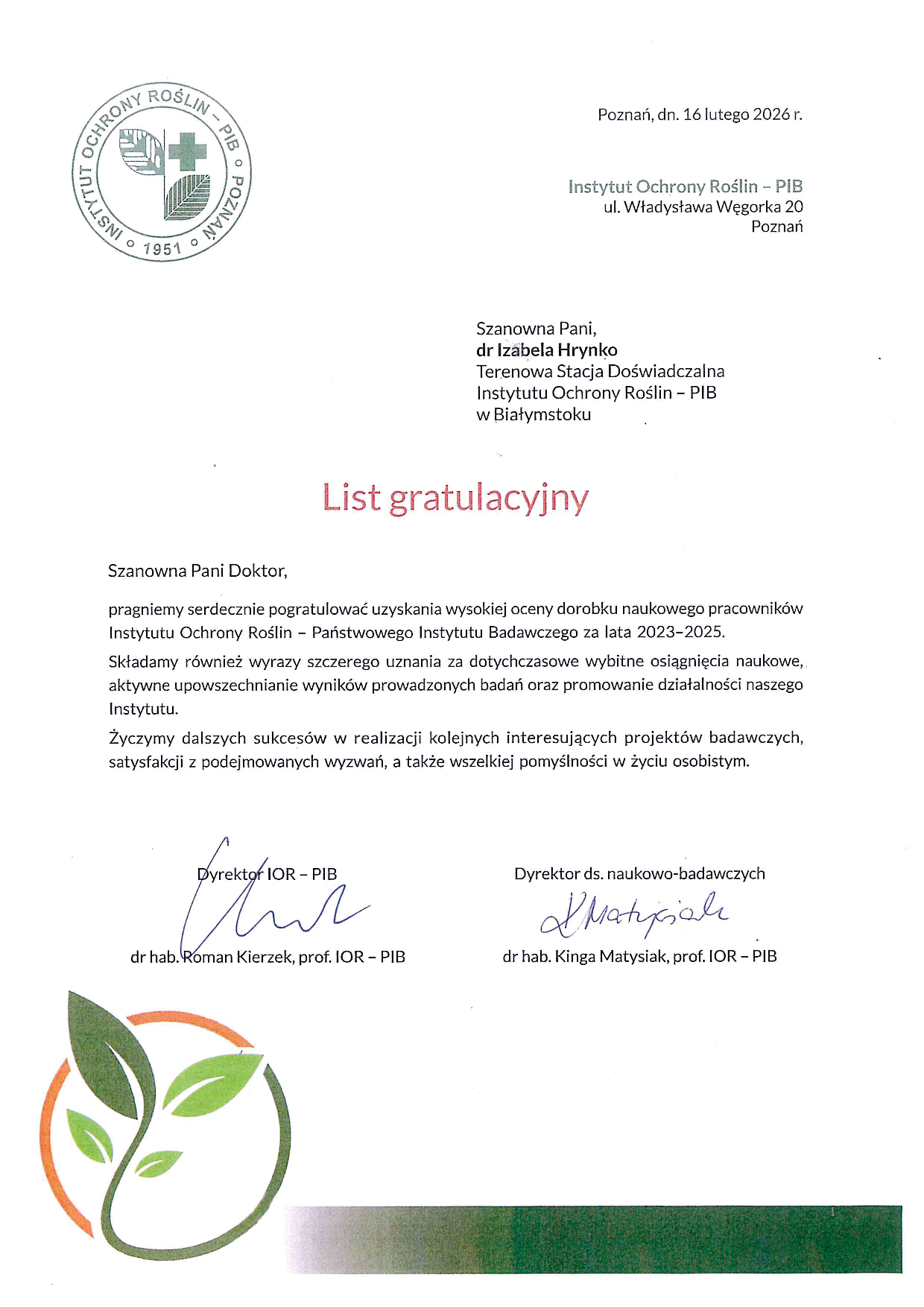 Z niezmierną satysfakcją informujemy o przyznaniu Instytutowi Ochrony Roślin –Państwowemu Instytutowi Badawczemu kategorii naukowej A w dyscyplinie rolnictwo i ogrodnictwo.