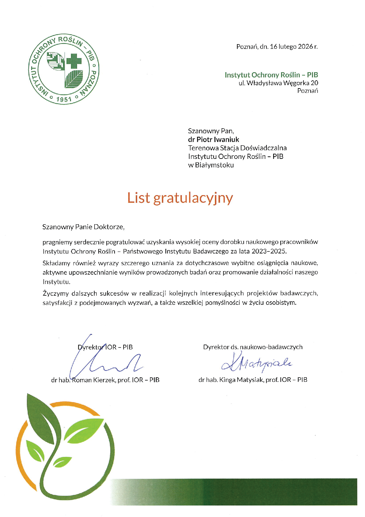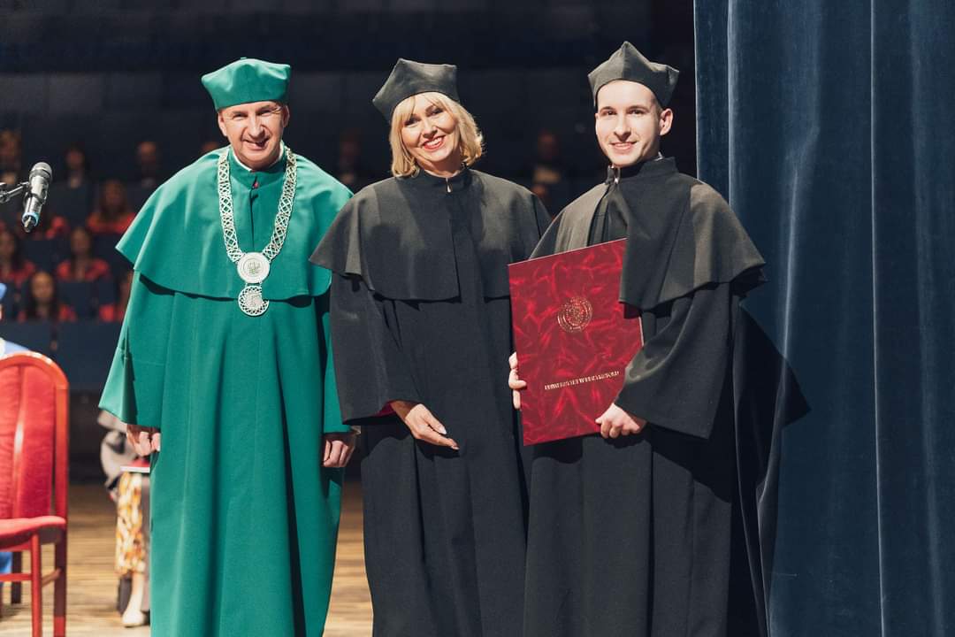 W dniu 13 marca 2024 r. na Uniwersytecie w Białymstoku odbyła się uroczysta promocja habilitacyjna i doktorska. Podczas ceremonii dr Piotr Iwaniuk odebrał dyplom nadania stopnia doktora z wyróżnieniem w dziedzinie nauk ścisłych i przyrodniczych za rozprawę „Study of selected crop plants responses in the pesticide – biostimulator – pathogen system” pod kierunkiem prof. dr hab. Bożeny Łozowickiej, która również miała zaszczyt uczestniczyć w tym doniosłym wydarzeniu.