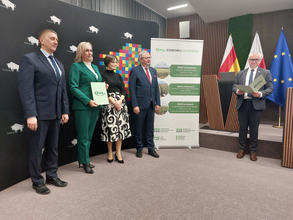 Od lewej Anna Krysztopik Dyrektor Departamentu Ochrony Środowiska w Podlaskim Urzędzie Marszałkowskim, Jerzy Leszczyński Zastępca Dyrektora ODR w Szepietowie, Radny Województwa Podlaskiego, Adam Walicki Prezes Zarządu Fundacji Technotalenty, Prof. dr hab. Bożena Łozowicka Kierownik TSD IOR-PIB w Białymstoku.
