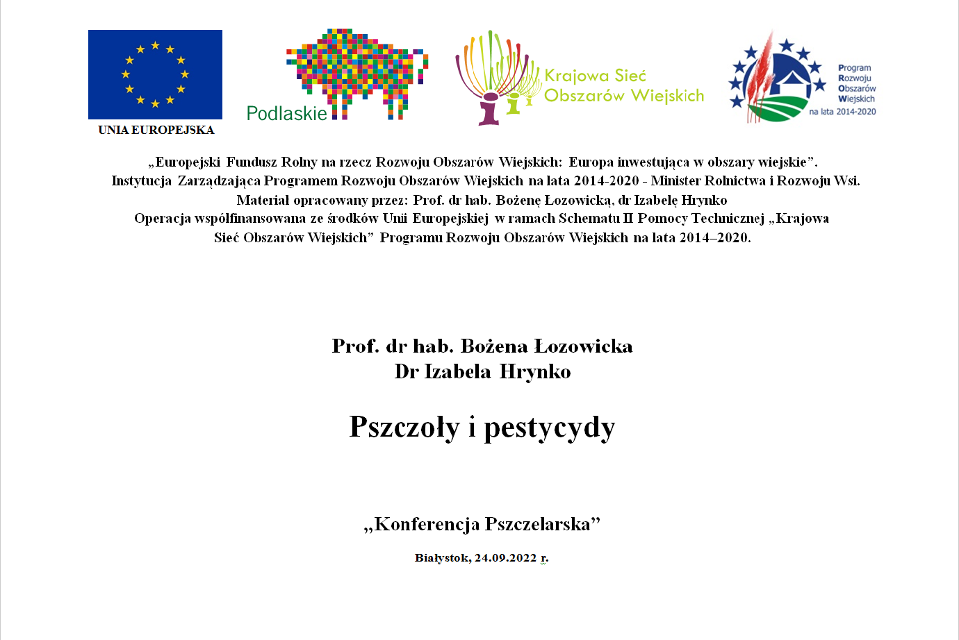 W dniu 24 września 2022 r. na Wydziale Biologii Uniwersytetu w Białymstoku Pani Profesor Bożena Łozowicka przedstawiła prezentację pt. „Pszczoły i pestycydy” w ramach Konferencji Pszczelarskiej.