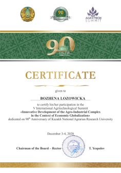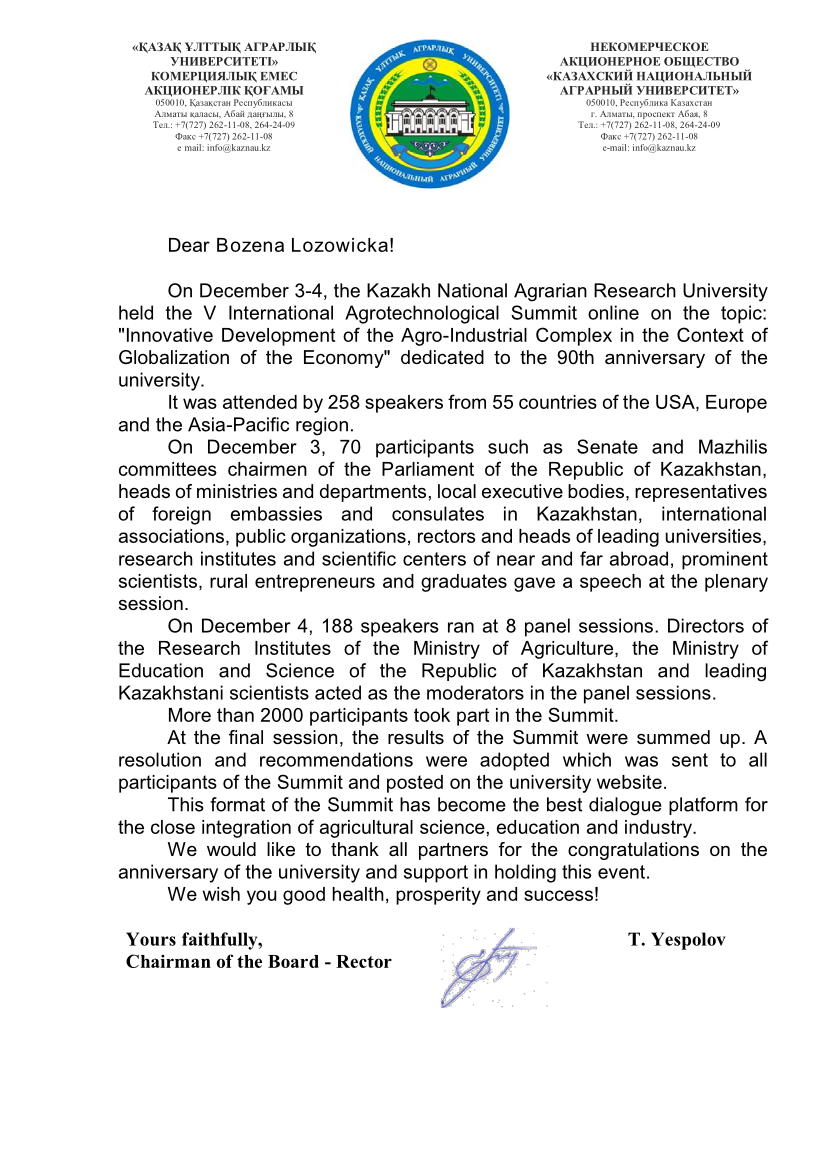 W dniach 3-4 grudnia w Ałmaty w Kazachstanie odbyła się międzynarodowa konferencja Innovative development of the agro-industrial complex in the context of economic globalization w ramach obchodów 90-lecia Kazakh National agrarian Research University, w której miała zaszczyt uczestniczyć Pani Prof. dr hab. Bożena Łozowicka, prezentując wyniki badań prowadzonych w Instytucie Ochrony Roślin- PIB.