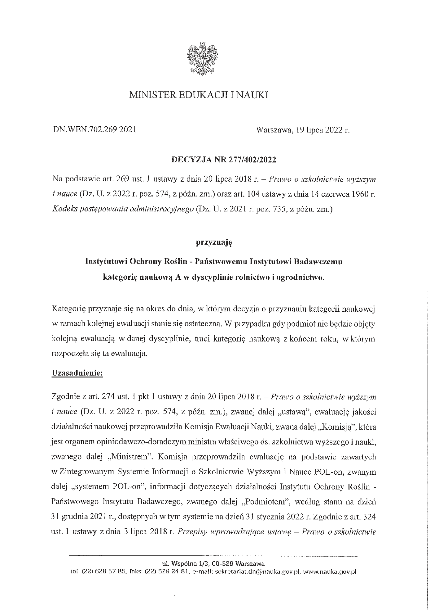 Przyznanie kategorii A Ministra Edukacji i Nauki Instytutowi Ochrony Roślin –PIB
