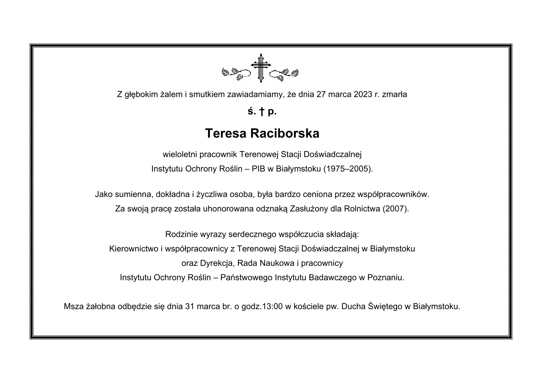 Kierownik TSD w Białystoku, Pani prof. dr hab. Bożena Łozowicka wraz z pracownikami pozostają w głębokim żalu i smutku, a sercem z rodziną i najbliższymi po wielkiej stracie jaką była nieoczekiwana śmierć Pani prof. dr hab. Nataszy Borodynko-Filas. Pani Profesor jako wieloletni pracownik Instytutu Ochrony Roślin – Państwowego Instytutu Badawczego dała się poznać jako wybitny naukowiec z zakresu wirusologii roślin, dynamiczny i odważny organizator ale też przede wszystkim jako wspaniała osoba. Pani prof. dr hab. Bożena Łozowicka miała przyjemność bezpośrednio współpracować jako Dyrektor IOR-PIB w latach 2017-2018 z Panią prof. dr hab. Nataszą Borodynko-Filas piastującą wówczas stanowisko Dyrektora ds. Organizacyjnych IOR-PIB.